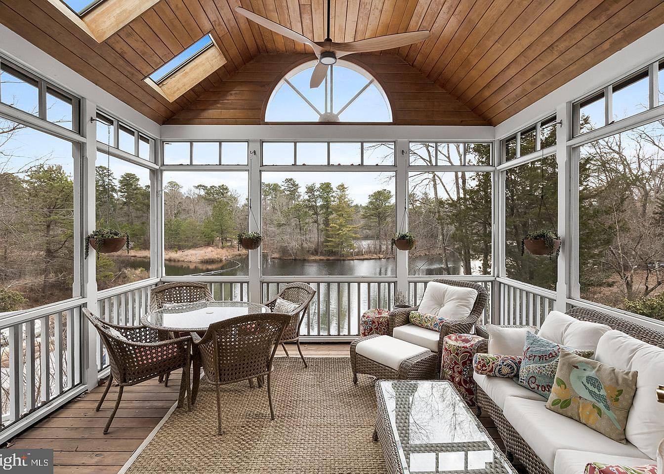 This inviting screened porch offers a serene space overlooking a tranquil pond surrounded by a natural landscape of tall trees. The ceiling is clad in warm-toned wooden planks, featuring a large arched window and two skylights that flood the room with natural light. A modern ceiling fan with wooden blades hangs centrally for comfort. The flooring consists of natural wood accented by a woven area rug. Furniture includes a wicker dining set with a round glass table and cushioned seating unit with colorful pillows adding a cozy, relaxed vibe to this peaceful retreat.