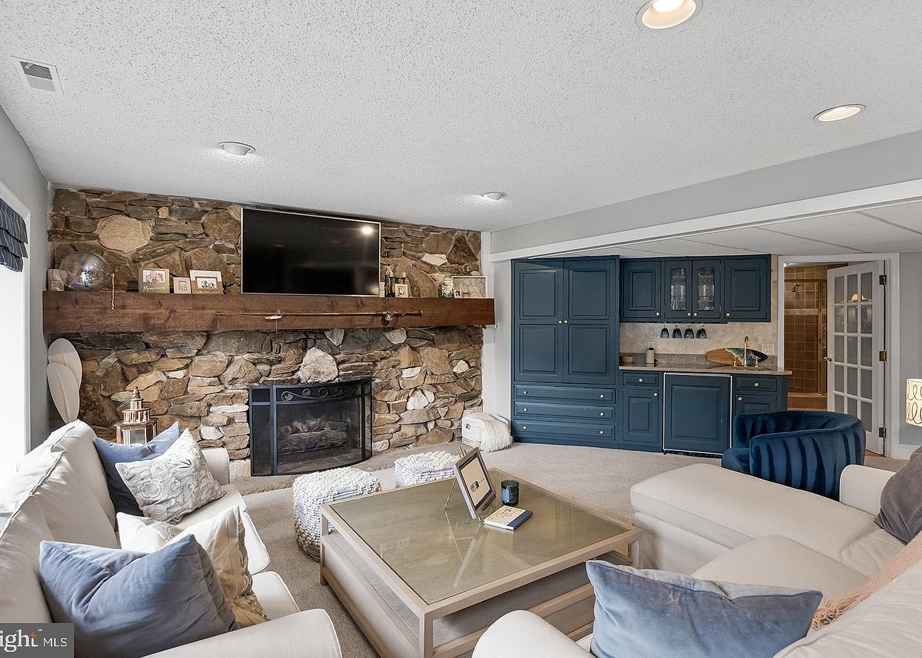 This inviting basement living room features a rustic stone fireplace with a broad wooden mantel that anchors the space. Above it, a flat-screen TV is mounted, creating a focal point perfect for relaxation and entertainment. The room is furnished with a comfortable sectional sofa in a soft neutral tone, adorned with an array of throw pillows in shades of blue and gray, contributing to a calm and cozy atmosphere. A large coffee table with a glass top sits centrally, flanked by knitted poufs for additional seating. The back wall showcases deep blue built-in cabinetry with brass hardware, including a small wet bar area with glass-fronted upper cabinets and under-cabinet lighting, blending functionality with elegant design. The carpeted floor and recessed ceiling lights complete this well-balanced and charming lounging space.