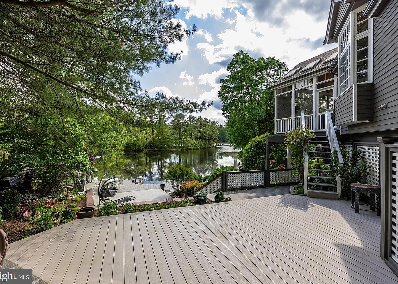This spacious backyard deck offers a serene transition from the home to the tranquil waterfront visible beyond. The large, light gray wooden decking extends generously, inviting outdoor furniture and gatherings. A set of stairs leads down to a lower patio area adjacent to the water, featuring lounge chairs ideal for relaxation while enjoying the waterfront view. The house’s exterior is clad in a dark gray siding with white trim, harmonizing with the natural greens of the mature trees and shrubs surrounding the property. The screened porch above the stairs adds a cozy, sheltered outdoor space. Overall, the setting combines natural beauty with comfortable, functional living areas.