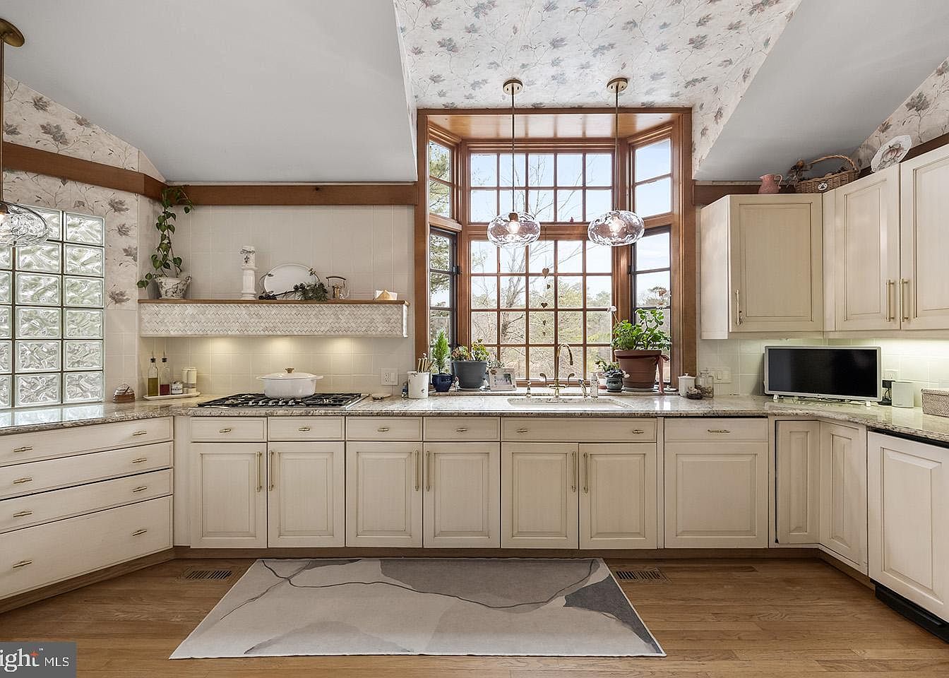 This bright kitchen highlights a large bay window framed in warm wood, flooding the space with natural light and offering a scenic view outside. Cream-colored cabinets with gold hardware line the lower half, paired with granite countertops that extend across a U-shaped workspace. The backsplash is subtle, with neutral-toned tiles and a decorative hood vent area above the stovetop, softly illuminated by under-cabinet lighting. Two glass globe pendant lights hang gracefully from the ceiling, which is adorned with a botanical patterned wallpaper matching the walls, adding charming texture. Potted plants on the windowsill inject fresh greenery, while a modern area rug anchors the light wood flooring beneath.