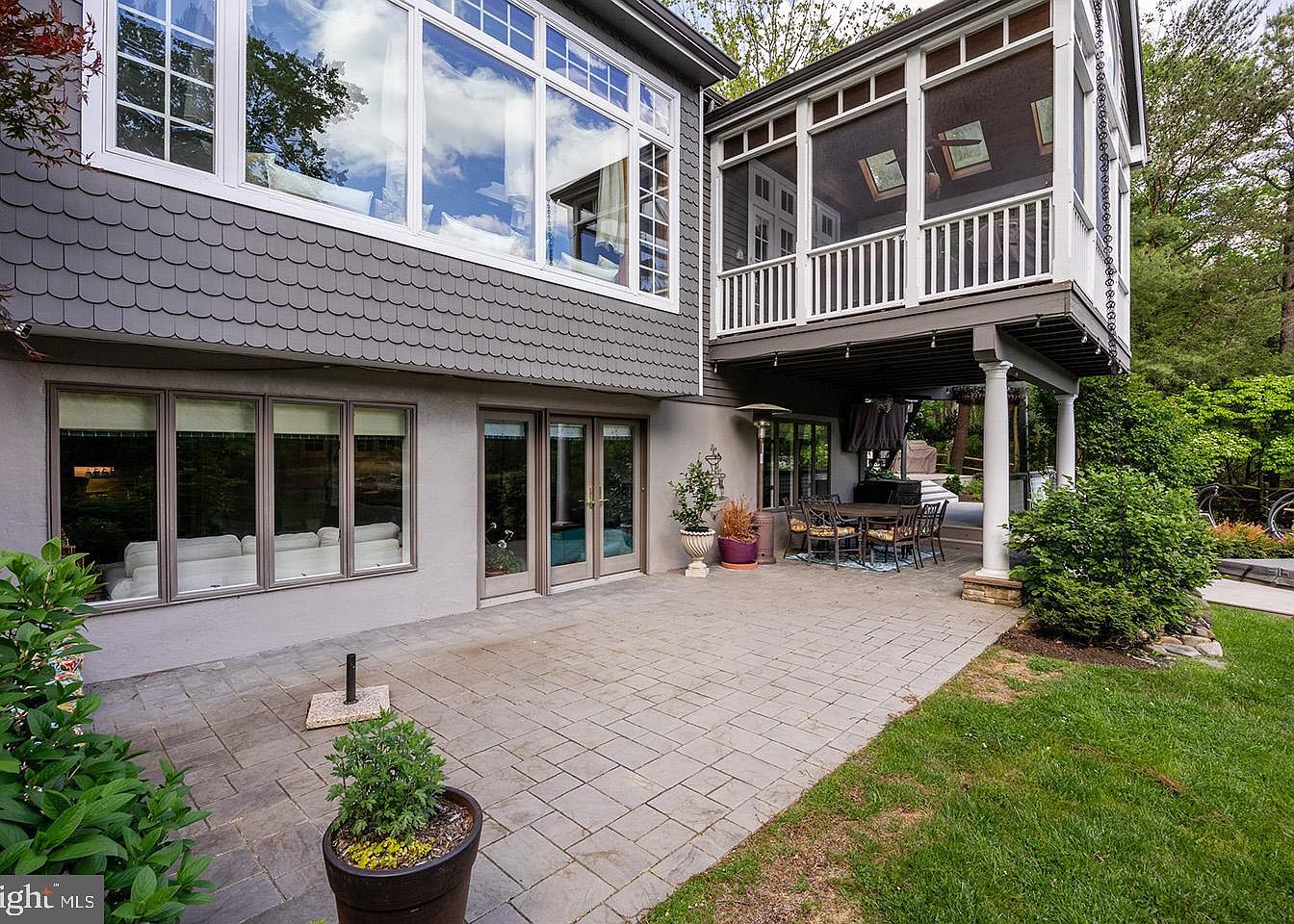 This outdoor space features a large paved patio with light gray stone tiles laid in a staggered pattern, creating a clean and spacious area for gatherings or relaxation. Adjacent to the patio is a covered porch elevated on sturdy white columns with a white railing and screen enclosure, offering protection from the elements while allowing natural light through skylights above. The home’s exterior blends soft gray siding with scalloped trim details, contributing to a charming, cottage-style aesthetic. Large windows and glass doors connect the interior living spaces seamlessly to the patio, enhancing the open, airy ambiance. Greenery around the perimeter adds a natural, inviting touch.