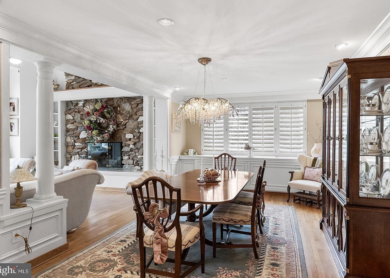 This elegant formal dining room features a classic rectangular wooden table surrounded by six chairs with a traditional design, upholstered in a pattern that adds subtle texture and charm. The room is anchored by a large, ornate area rug with muted floral motifs that complement the hardwood floor beneath. A crystal chandelier with a cascading design hangs above the table, providing a focal point of refined lighting. White plantation shutters cover the windows, allowing natural light to softly diffuse the space. To one side, a sophisticated wooden china cabinet displays fine dishware, while an armchair with cushions offers a cozy corner. An adjoining living area is partially visible, framed by stately white columns and highlighted by a rustic stone fireplace adorned with a floral wreath, blending warmth and formality in this inviting space.