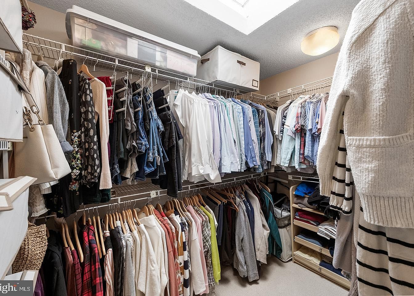 This walk-in closet is organized and thoughtfully arranged, showcasing an efficient use of space with dual hanging rods on three sides. The upper rods hold neatly hung shirts, blouses, and jackets in light to dark hues, arranged by type and color, while the lower rods accommodate casual shirts and sweaters. Shelved compartments on the right side provide folded clothing storage, enhancing the room’s functionality. A skylight overhead floods the space with natural light, brightening the soft neutral beige walls and beige carpeted floor. White wire shelving and storage bins atop add extra capacity and a clean, airy feel to the closet.