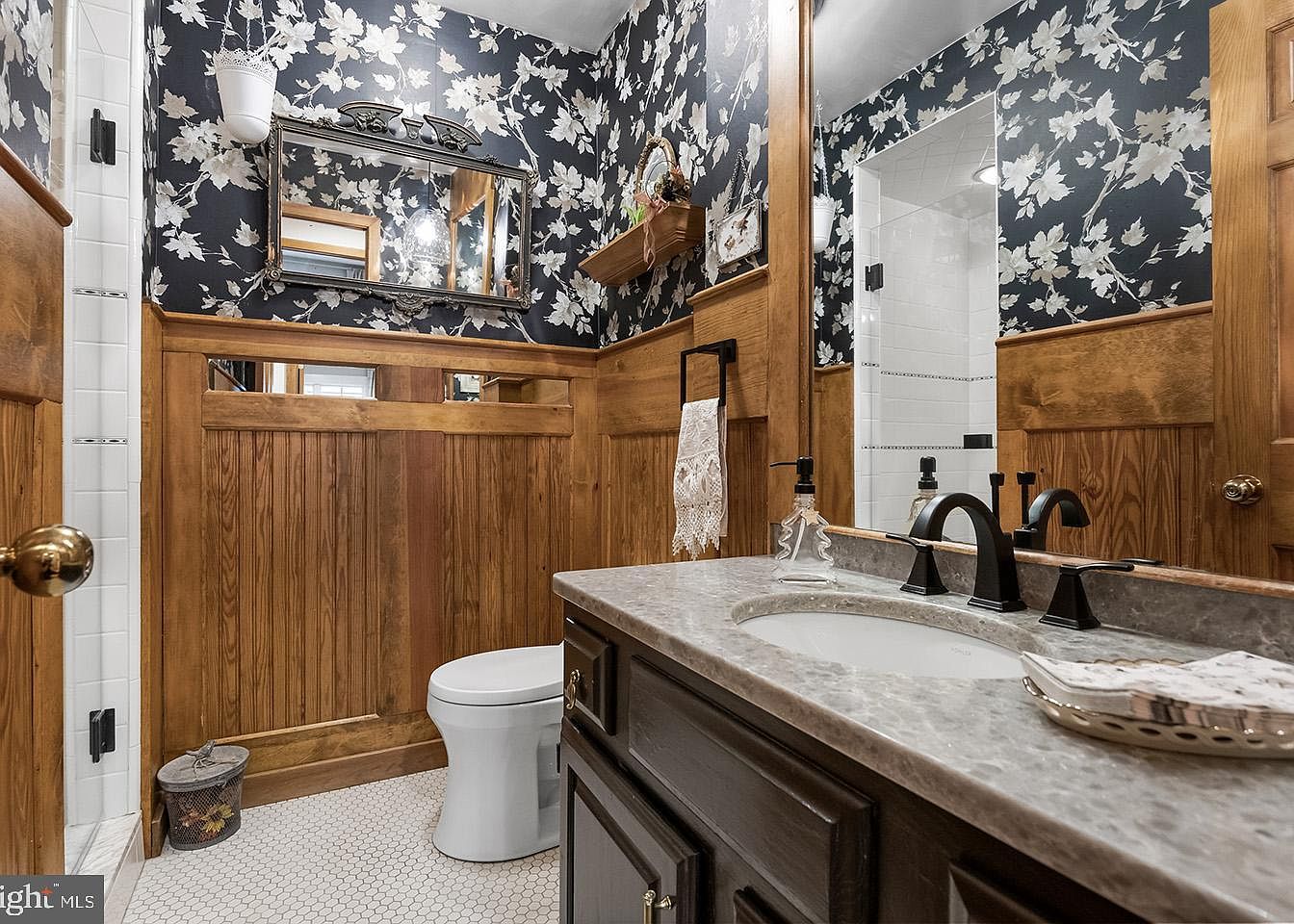 This bathroom combines rustic charm with modern touches for a cozy yet elegant feel. Wood paneling covers the lower walls, providing warmth and texture, while the upper walls are adorned with dark navy floral wallpaper, adding a dramatic contrast. The white hexagonal tile floor brightens the space and complements the wood’s natural tones. A granite countertop sits atop a rich dark wood vanity, paired with matte black fixtures that contribute a contemporary edge. A large mirror framed in antique wood enhances the room’s depth, reflecting light and emphasizing the mix of classic and modern design elements.