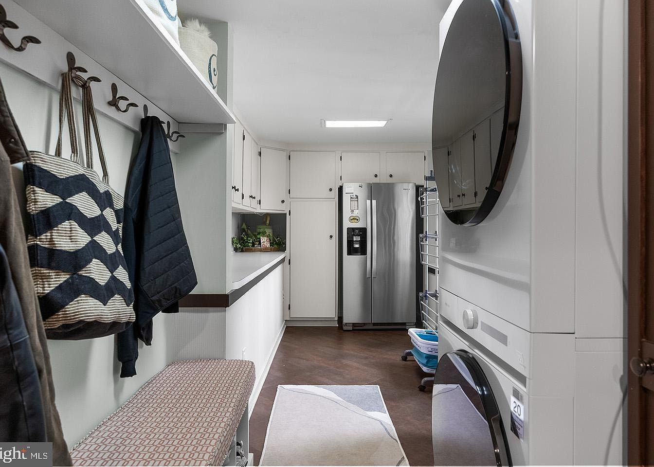 This space combines functionality with a sleek design, serving as both a mudroom and laundry area. The muted white walls and cabinetry provide a clean backdrop, highlighting the stainless steel refrigerator at the far end, which complements the washer and dryer stacked on the right side. The patterned cushioned bench on the left offers a cozy spot for removing shoes, accompanied by multiple hooks holding jackets and bags. A beige and gray runner rug adds warmth to the dark flooring, while a small window nook with greenery adds a touch of nature. The organized, practical layout maximizes usage while maintaining an inviting atmosphere.