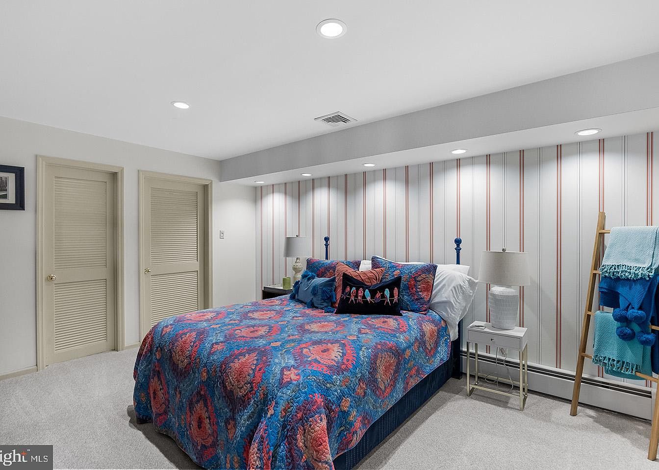 This intimate bedroom space features a striking blue and coral patterned bedspread set against a backdrop of soft cream walls with vertical red and white stripes. Two louvered closet doors in a muted beige occupy one side, adding subtle texture. A modern white nightstand with a simple lamp sits neatly beside the bed, echoing the clean and minimal aesthetic. Recessed ceiling lights create a warm ambiance, and a wooden towel ladder with blue throws introduces a casual, homey touch. The light carpeting and streamlined design provide a cozy, inviting retreat within the home.