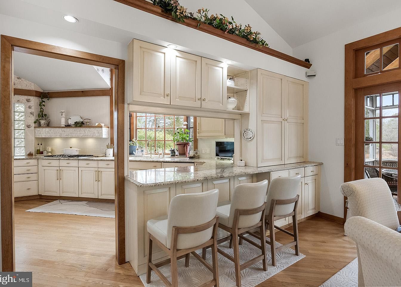 This cozy kitchen breakfast bar features light cream cabinetry with subtle decorative molding, enhanced by warm wood accents on the door frames and furniture. A granite countertop offers a polished, durable surface, extending into a peninsula with seating for three on cushioned, wooden bar stools. Above the cabinets, a decorative ledge adorned with greenery adds a natural touch. The space is well-lit, with recessed lighting above the cabinets and natural light flowing in from large windows. The adjacent kitchen area showcases matching cabinetry and a stove beneath a range hood framed with coordinating wood details. The flooring is a light-toned wood, creating a welcoming, warm atmosphere that blends traditional and comfortable styles seamlessly.