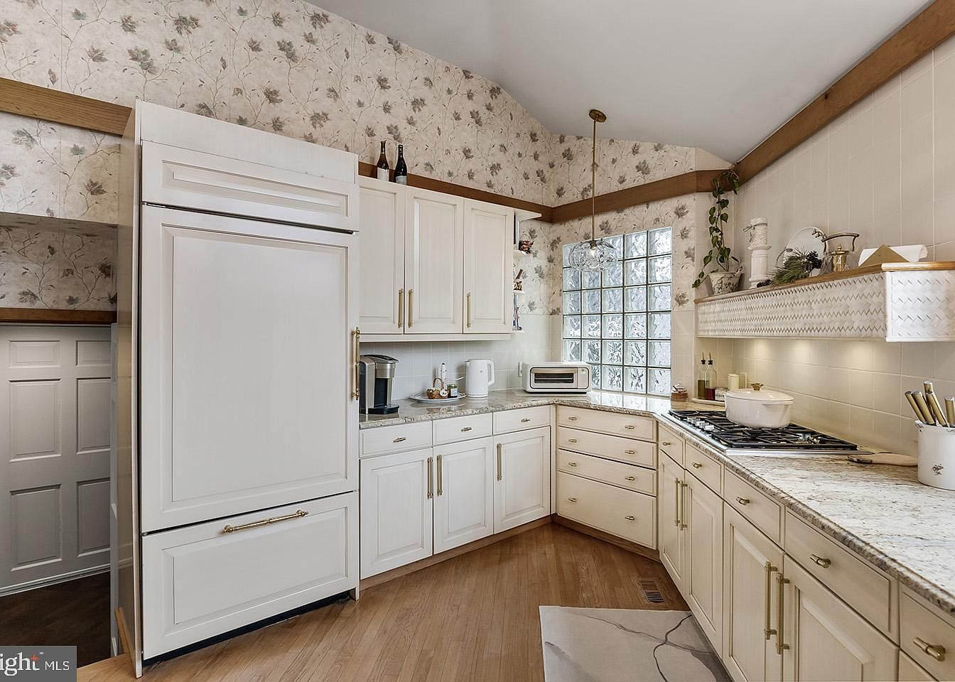 This kitchen corner features a spacious L-shaped counter layout with white cabinetry accented by brass handles, creating an elegant yet warm atmosphere. The granite countertops add a refined touch and complement the wood flooring that extends throughout the space. A built-in refrigerator seamlessly integrates into the cabinetry for a sleek look, while a glass block window allows soft, diffused natural light to illuminate the workspace. The stove area is highlighted by a decorative hood, adorned with subtle patterns and decorative items, enhancing the classic and cozy aesthetic. Floral wallpaper on the vaulted ceiling and upper walls adds a vintage charm.