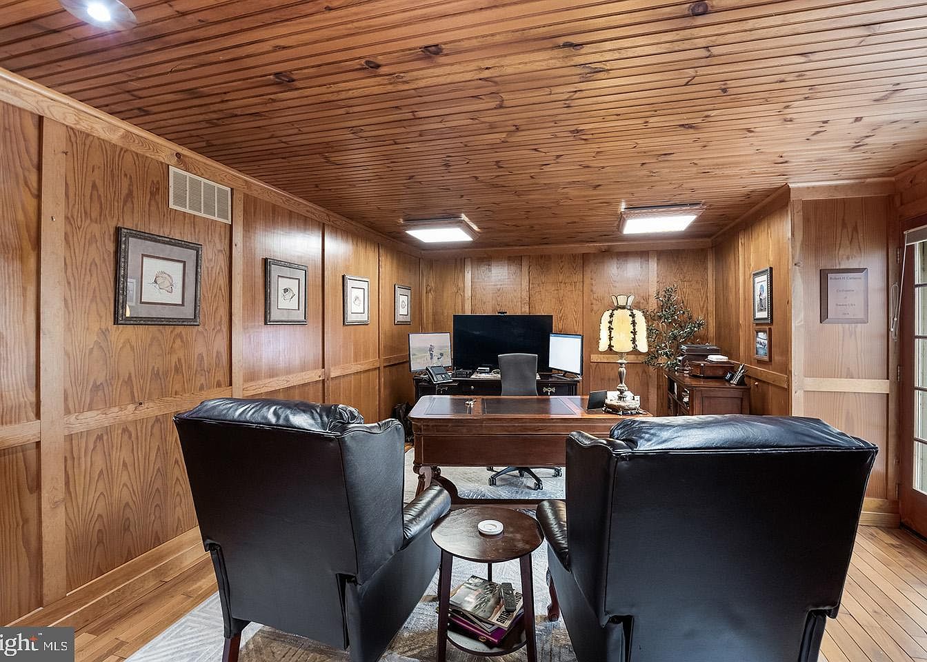 This warm, wood-paneled office features rich, natural wood walls and a matching wood plank ceiling, creating a cozy, cabin-like atmosphere. The workspace centers around a dark polished desk facing two black leather armchairs separated by a small round side table with magazines and remote controls underneath. Framed art pieces line the walls, complementing the wood’s grain. The desk area includes dual computer monitors and a classic decorative lamp with a fringed shade, adding a vintage touch. A hardwood floor under a subtle rug anchors the room, enhanced by a modest wooden credenza with plants and office essentials along the back wall, providing organized functionality.