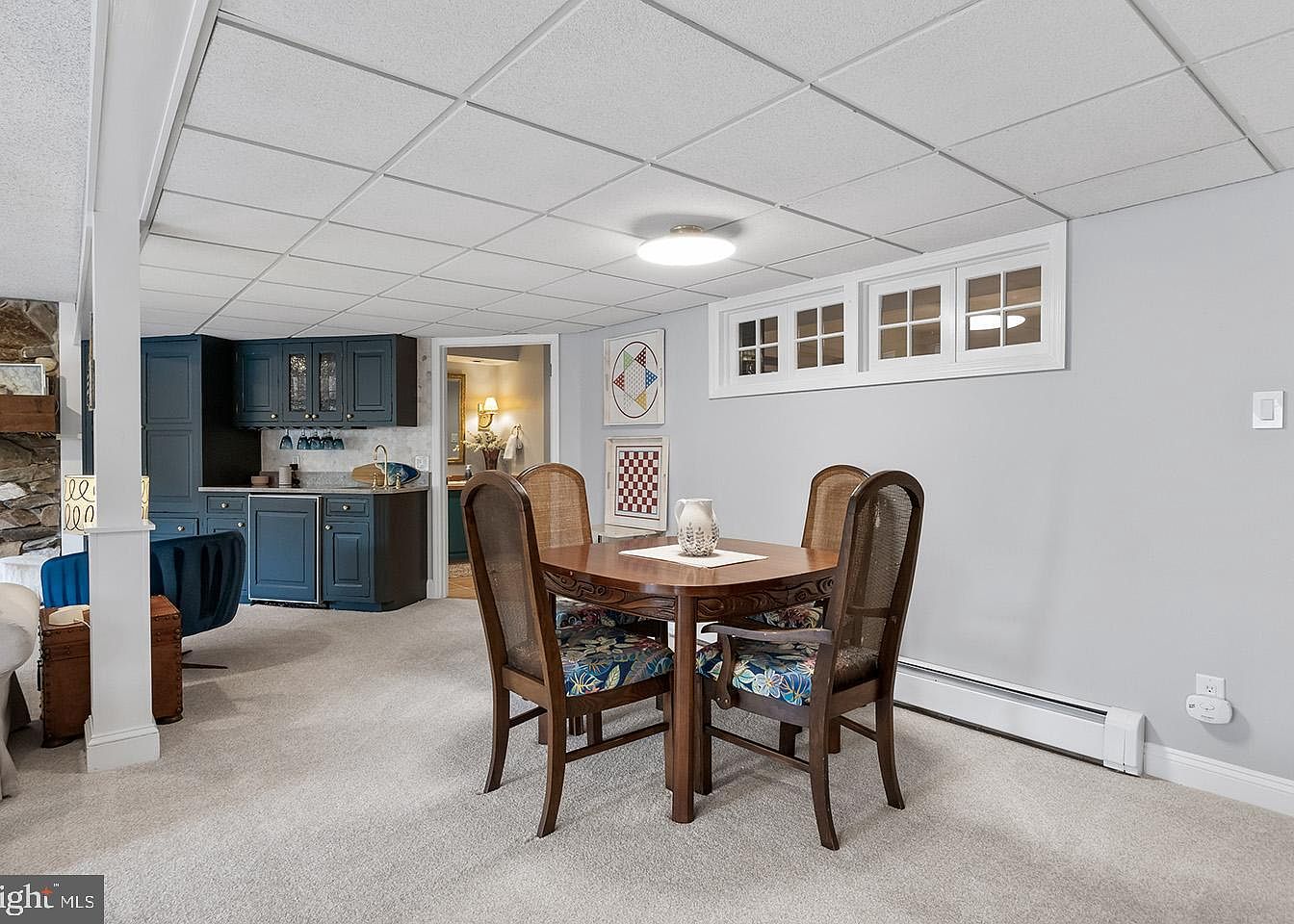 This cozy basement dining area features soft gray walls paired with a neutral carpet, creating a light and inviting atmosphere. The room is anchored by a carved wooden dining table with four matching chairs that have floral-patterned cushions adding a touch of color. A small wet bar with navy blue cabinetry and glass-front upper cabinets sits in the corner, providing a stylish and functional space for entertaining. White framed clerestory windows near the ceiling allow natural light to filter in subtly. Overall, the design combines comfort with classic elegance in a compact, multi-functional basement space.