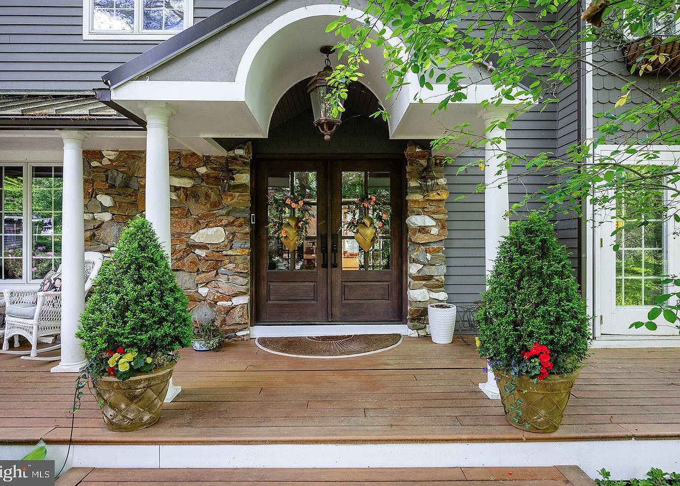 The entryway features a charming front porch with warm wooden flooring and steps leading up to double wooden doors, accented by decorative glass panels and floral wreaths. White columns support an arched portico, introducing a classic architectural element that contrasts beautifully with the more rustic stone façade framing the doorway. The gray siding complements the natural stone’s earthy tones while greenery in large planters adds vibrant pops of color and life to the symmetrical porch space. A vintage-style hanging lantern under the arch enhances the welcoming atmosphere, blending elegance with cozy natural charm.