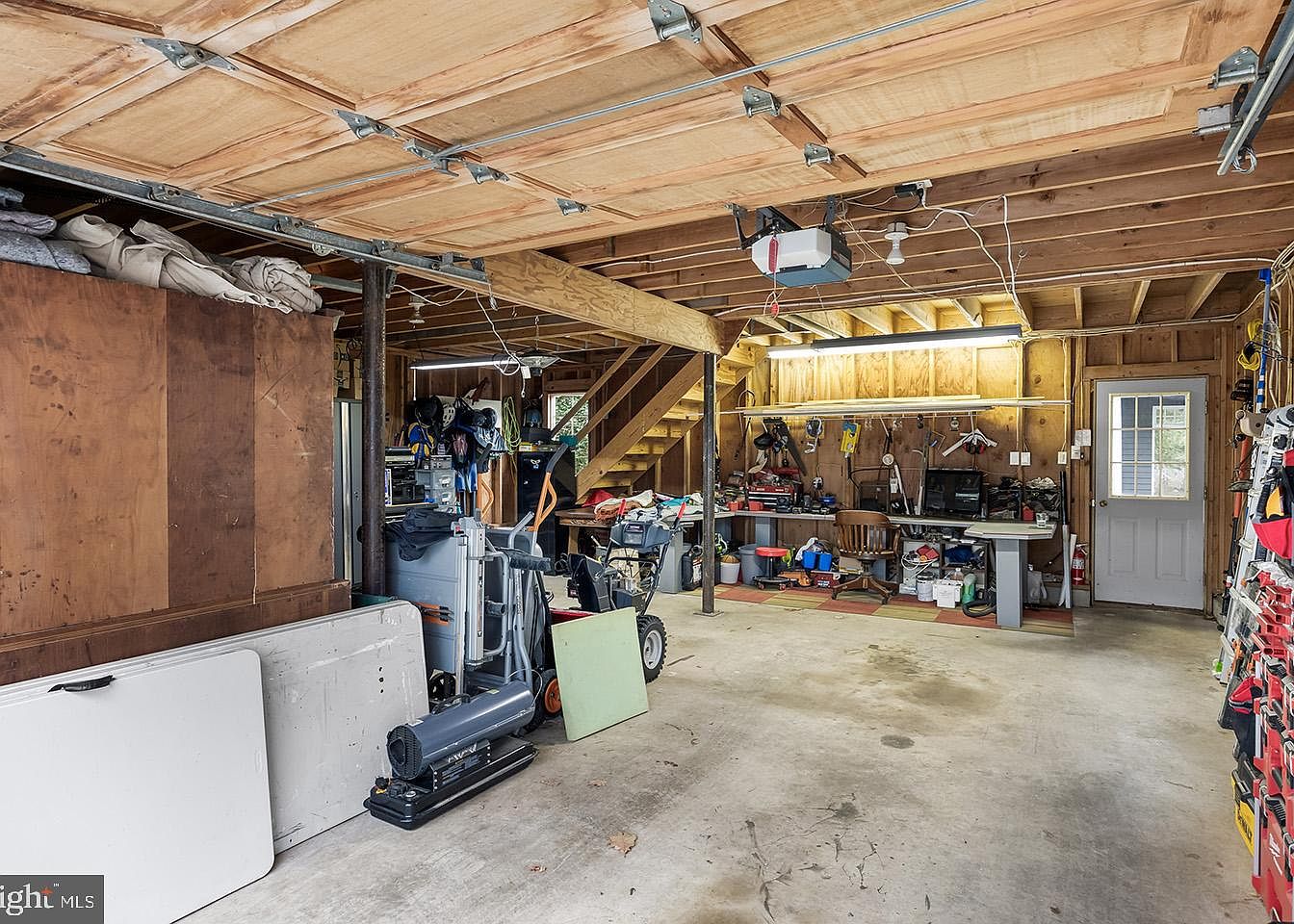 This spacious garage serves as both a multi-functional storage and workshop area, featuring an unfinished ceiling and walls with exposed wood framing and beams. The concrete floor bears signs of regular foot and equipment traffic, contributing to its utilitarian character. A workbench spans the far end, cluttered with various tools, equipment, and a rolling office chair, illuminated by a bright fluorescent light fixture. The space is organized yet busy, with shelves and hooks holding tools and gear. A white door with window panels leads outside, adding a touch of natural light. The overall aesthetic is rugged and practical.