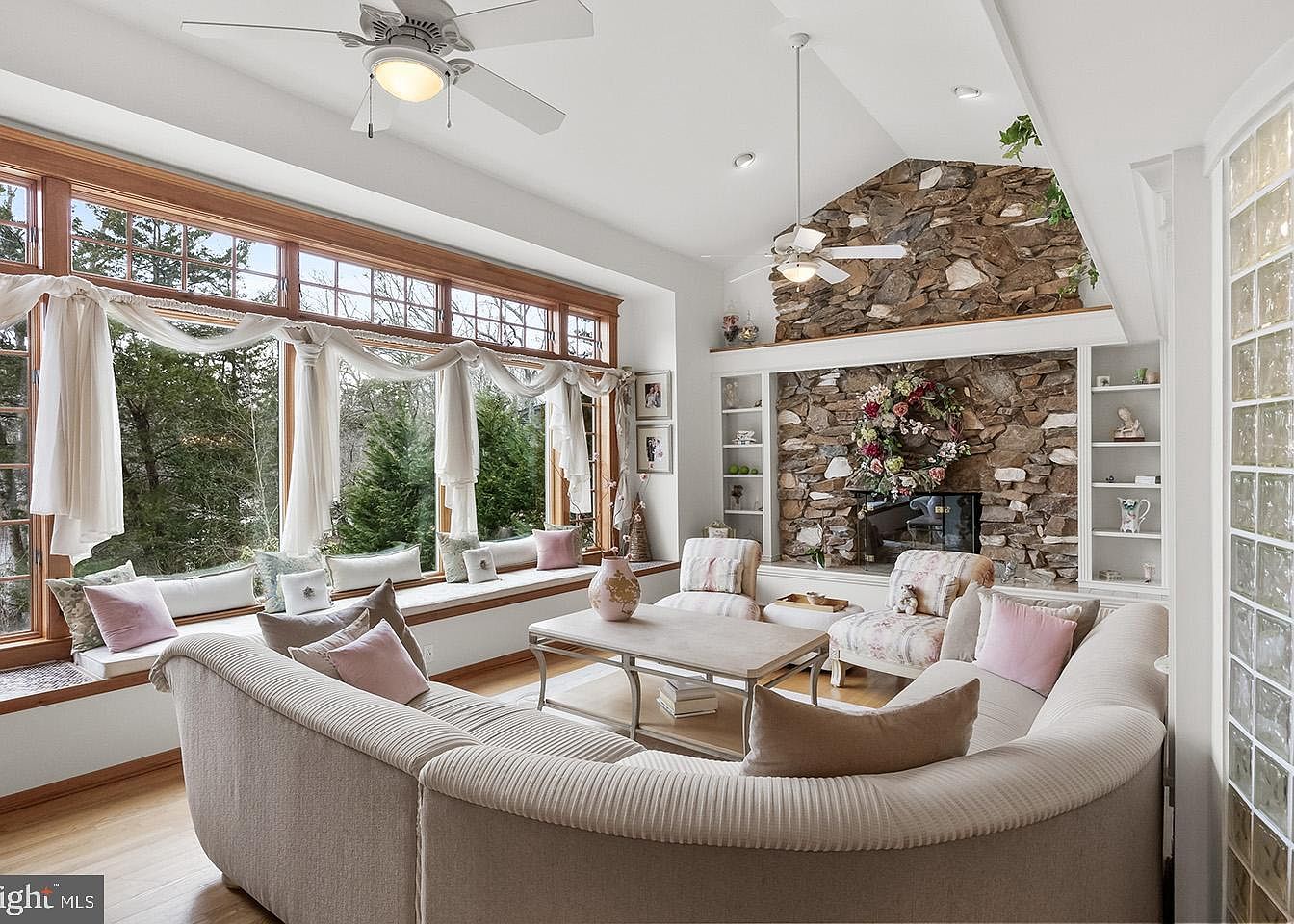 This living room brightens with large wood-framed windows accented by soft, white swagged curtains that allow natural light to flood the space while framing lush greenery outside. A curved, cream-colored sectional sofa with pastel cushions creates a welcoming conversational nook centered around a light wood coffee table. Two upholstered chairs with a floral pattern add delicate charm, complementing the subtle blush tones. The stone fireplace serves as a striking focal point with a large wreath and built-in white shelving on either side, adding both texture and cozy character to this serene, airy room.
