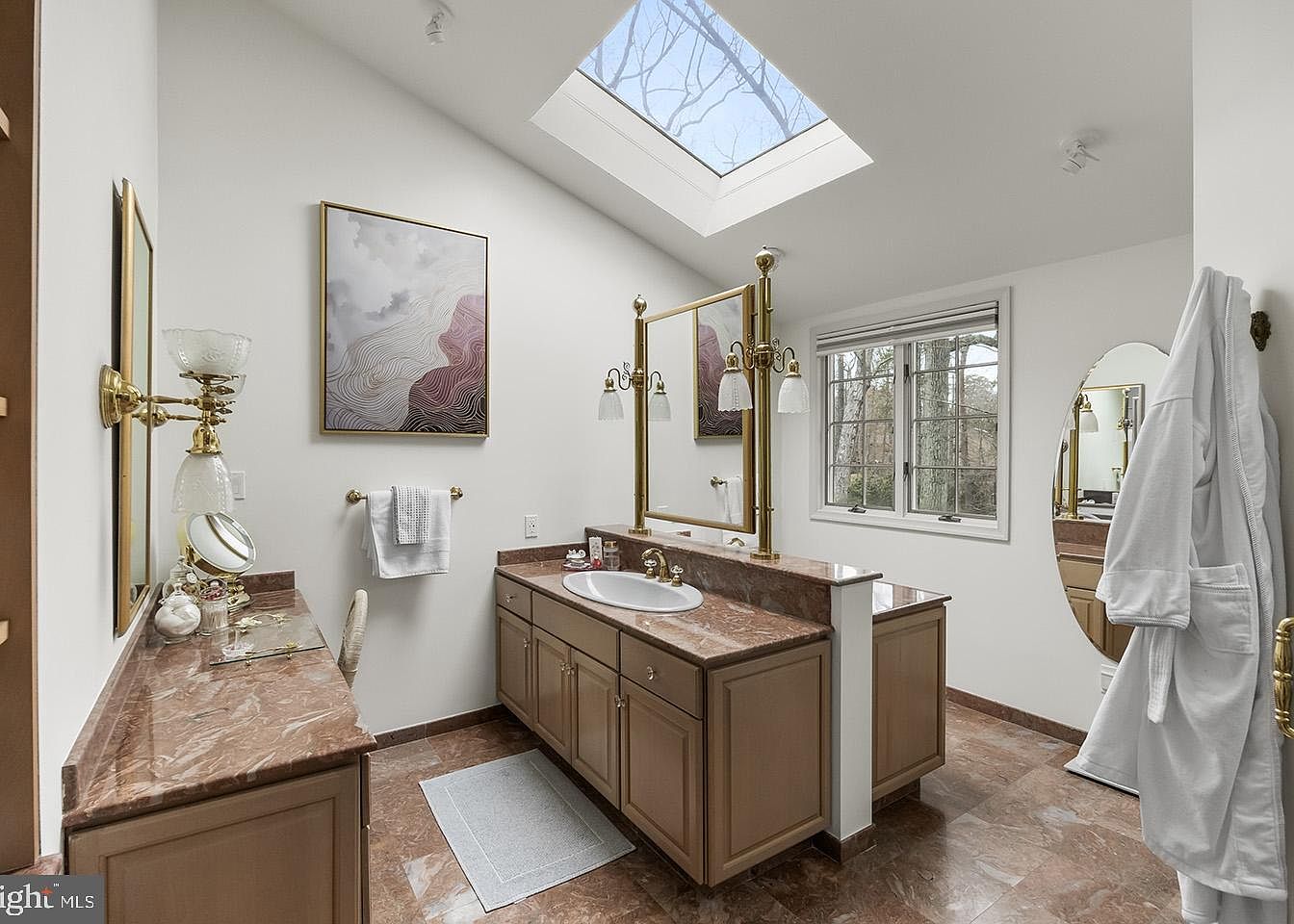 This bathroom vanity area features a spacious layout with warm-toned marble countertops extending across both a sink vanity and a separate makeup/dressing table. Light brown cabinetry complements the marble flooring, creating a cohesive earthy palette. A skylight above floods the room with natural light, enhancing the airy ambiance. Brass fixtures with frosted glass lamps add vintage elegance, paired with a large mirror framed by matching brass sconces. A framed abstract wall art adds subtle modern flair. An oval mirror near a window overlooks wooded scenery, while a white bathrobe hangs neatly on an ornate brass hook, suggesting relaxation and comfort.