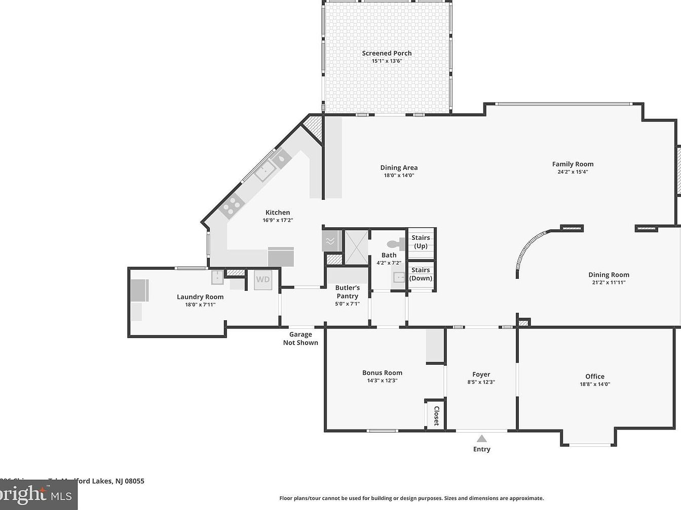 This floor plan highlights a spacious and well-planned main level, featuring multiple interconnected living spaces for flexible use. The expansive family room measuring 24’2″ by 15’4″ offers a generous area for relaxation and gatherings, flowing seamlessly into the dining area and an additional formal dining room that adds elegance. The kitchen, uniquely angled and sized at 16’9″ by 17’2″, includes proximity to a butler’s pantry, enhancing storage and entertaining convenience. Adjacent to the kitchen, the laundry room spans 18′ by 7’11”, while a screened porch extends outdoor living. A versatile bonus room, office, and strategically placed powder bath round out this well-thought layout, accessed via a welcoming foyer near the entry.