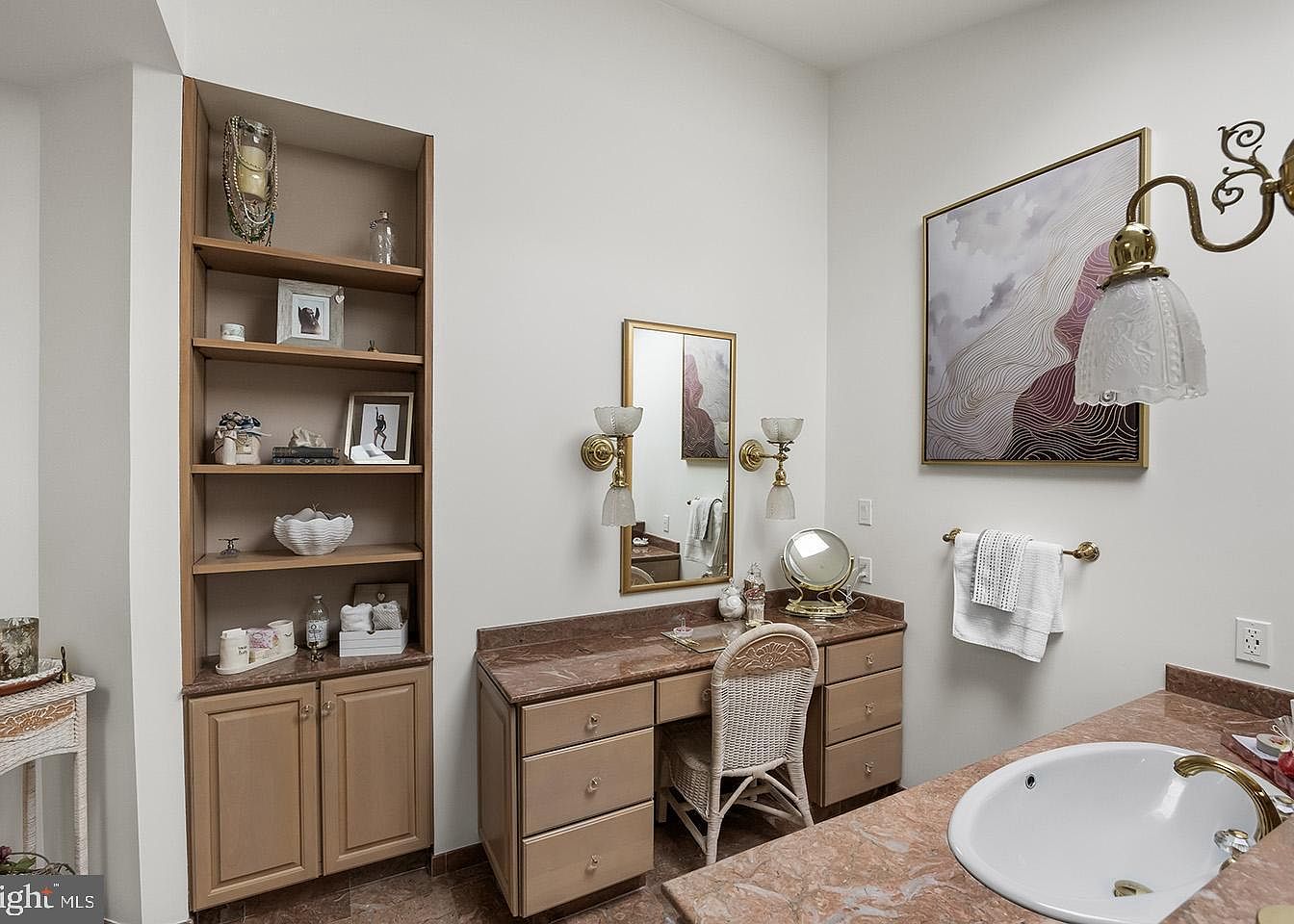 This serene bathroom vanity space features a warm beige and muted rose color palette, anchored by polished marble countertops. A built-in wooden shelving unit offers both display and storage, holding decorative items and toiletries. The vanity has multiple drawers providing ample storage, paired with a wicker chair that blends natural textures with functionality. Two vintage-style brass sconces flank a rectangular mirror, adding classical charm and soft lighting. The walls are painted a crisp white, contrasting gently with the cabinetry and marble surfaces. An elegant, framed abstract artwork and brass fixtures contribute a refined, timeless aesthetic.