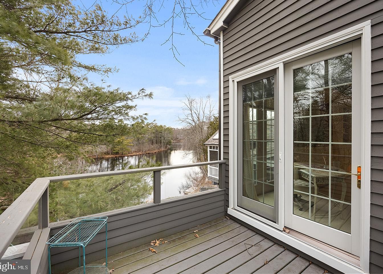 This balcony offers a peaceful outdoor retreat with a serene view of a gently flowing river bordered by lush trees. The space features wide gray wooden deck planks and a simple railing that combines solid panels with horizontal supports, allowing an unobstructed vista. Sliding glass doors with white grids provide access to the interior, adding a classic architectural detail that contrasts softly against the medium gray siding of the house. A small, minimalist metal table in light blue adds a subtle pop of color, enhancing the natural, calming ambiance of this inviting spot.
