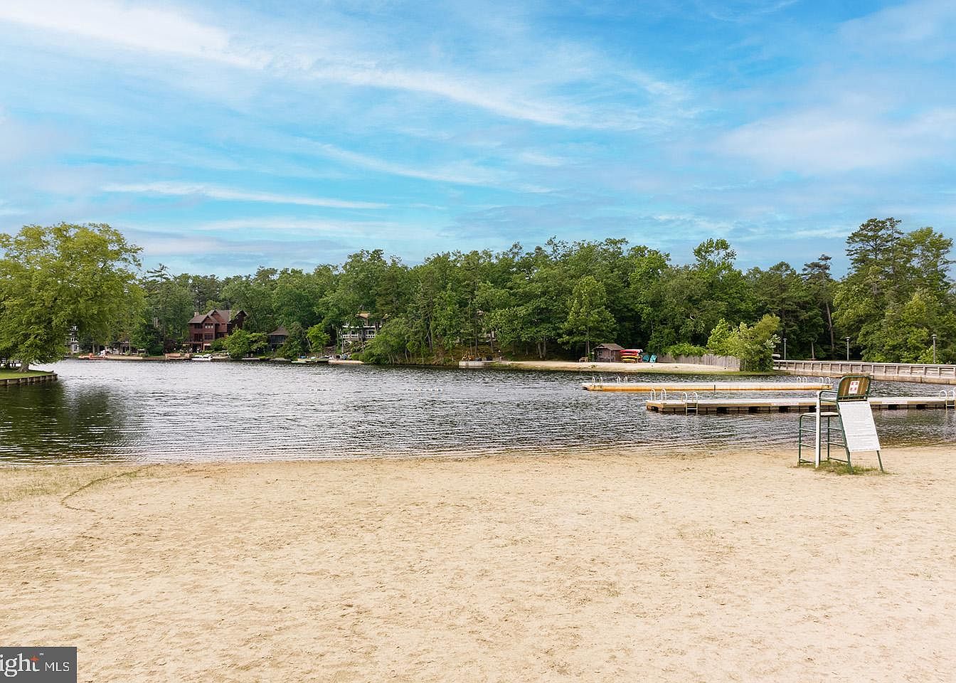 This serene community beach offers a peaceful sandy shore that gently meets a calm lake, ideal for relaxing and water activities. The lake is bordered by lush greenery and mature trees providing a natural, tranquil backdrop. Wooden docks extend into the water, perfect for swimming or docking small boats. Across the water, charming lakeside homes are visible, showcasing rustic architecture that blends seamlessly with the wooded surroundings. A lifeguard chair with posted rules suggests a family-friendly environment, emphasizing both safety and leisure in this inviting outdoor space.