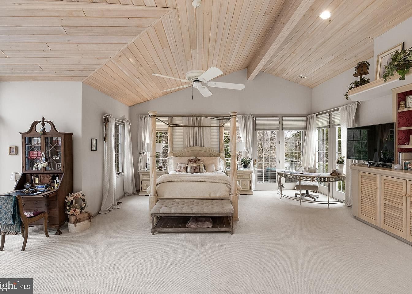 This serene master bedroom combines spacious comfort with a light, airy aesthetic. The vaulted ceiling is clad in pale wood planks, adding natural texture and warmth, complemented by a white ceiling fan that subtly blends into the ceiling. Soft beige carpeting covers the floor, enhancing coziness. Centered is a grand four-poster bed in a light wood finish, flanked by matching nightstands adorned with elegant lamps. The room features multiple large windows and French doors, allowing ample natural light and providing views of the greenery outside. On one side, a delicate curved desk and chair create a charming workstation, while on the other, a dark antique secretary desk and chair offer classic character. Across from the bed, a light wood media cabinet holds a flat-screen TV. The neutral color palette and tasteful mix of vintage and contemporary furnishings create a tranquil retreat perfect for relaxation and productivity.