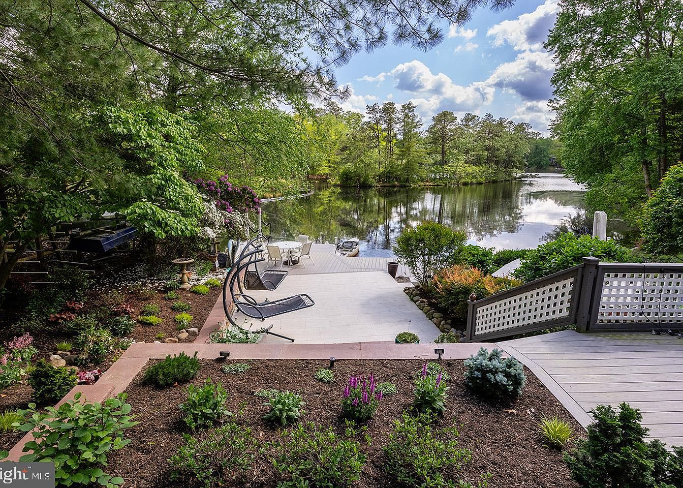 This tranquil outdoor space features a multi-level patio that gently descends toward a serene lake. The area combines a carefully tended garden with lush greenery and colorful flowers, which border the stone and wooden decking. Two modern, hanging lounge chairs offer a perfect spot for relaxation while taking in views of the water and surrounding woods. A small round table with white chairs creates an inviting dining nook near the water’s edge. The overall design emphasizes seamless connection with nature, blending expansive open sky, reflective water, and vibrant landscaping for a peaceful retreat.