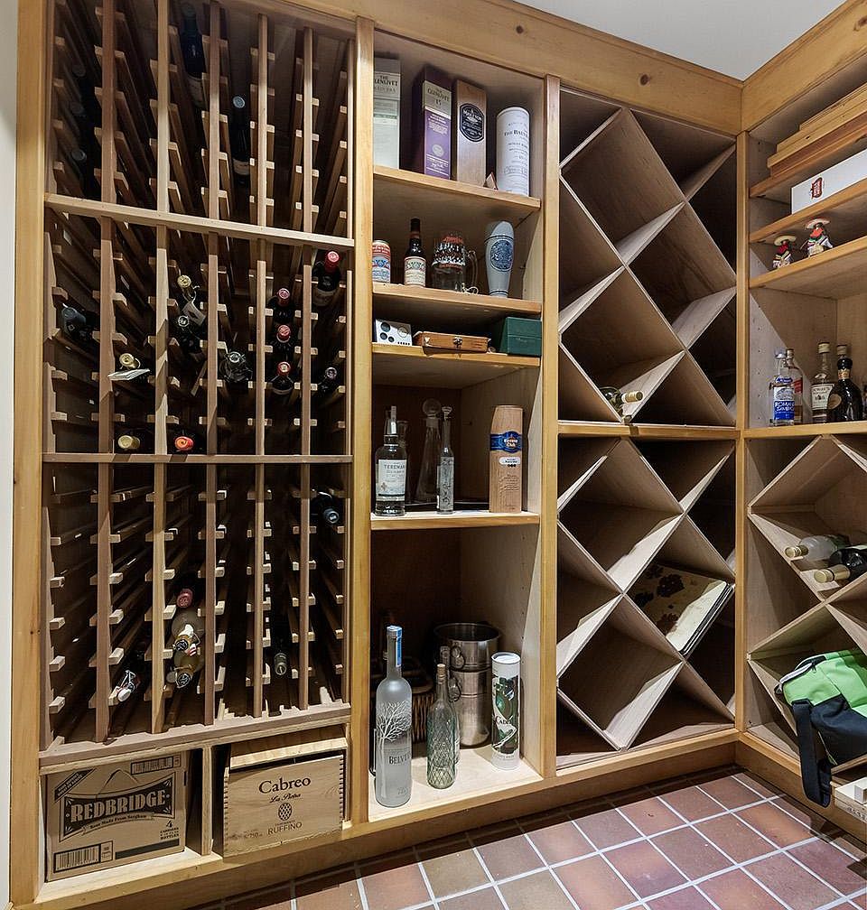 This space features a well-organized wine cellar corner, crafted with warm, natural wood shelving that lends a rustic yet sophisticated charm. The layout includes multiple vertical racks for individual bottles, open shelves displaying spirits, and diamond-shaped compartments for larger bottle storage. The terracotta tiled floor adds earthy tones, complementing the wooden structure. The shelves are neatly stocked with an assortment of wines, liquors, and glassware, indicating a dedicated area for beverage storage and display. This setup balances function and style, making it an inviting and practical spot for any wine enthusiast.