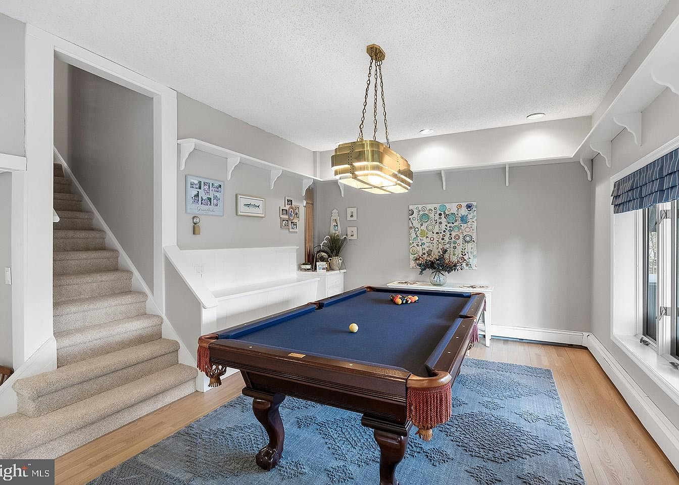 This game room centers around a classic wooden pool table with a striking navy blue felt surface complemented by red tassel pockets. The space is painted in soft grey tones accented by white trim and wainscoting, creating a calm and inviting atmosphere. A large patterned blue rug grounds the table on warm light wood flooring. Natural light pours in from the sizable window framed with blue-striped roman shades. Unique architectural details include an elevated built-in bench along one wall and a modern gold pendant light hanging above the pool table, adding a touch of contemporary elegance.