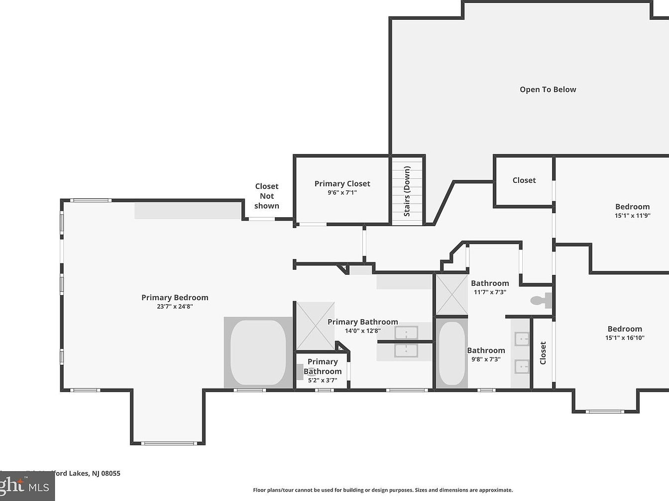 This floor plan highlights an expansive primary suite area that combines comfort and functionality. The primary bedroom spans an impressive 23’7″ by 24’8″, featuring ample natural light from multiple windows. Adjacent to the bedroom, the large primary bathroom, measuring 14’0″ by 12’8″, includes a separate smaller bathing section for enhanced usability. The suite also contains a spacious primary closet at 9’6″ by 7’1″, ensuring generous storage space. Additional bedrooms and bathrooms are connected seamlessly through a hallway, showing thoughtful separation between private and shared areas. Stairs lead to lower floors, emphasizing a fluid multi-level design.