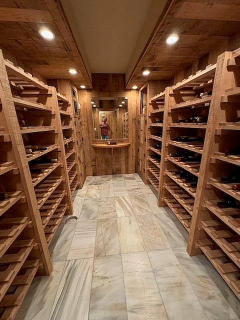 This wine cellar features a narrow, rectangular layout with floor-to-ceiling wooden racks lining both sides, providing ample storage for a variety of wine bottles. The warm, natural wood tones dominate the space, creating a rustic yet refined atmosphere. The ceiling is outfitted with recessed lighting, illuminating the area evenly without overpowering the serene ambiance. A small wooden shelf with a mirror is positioned at the far end, adding depth to the room while serving as a functional space for wine tasting or accessory placement. The polished marble floor introduces a touch of elegance and contrasts beautifully with the wood’s hearty texture.