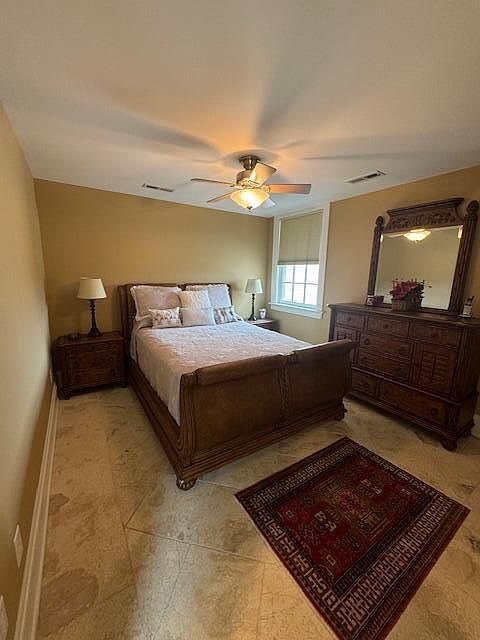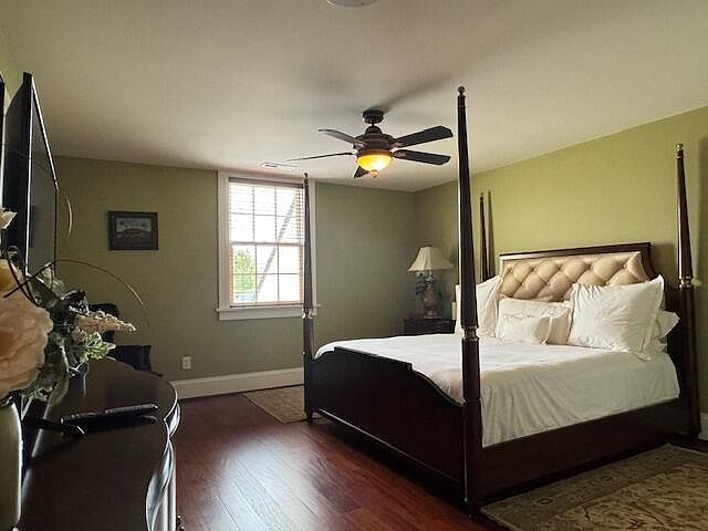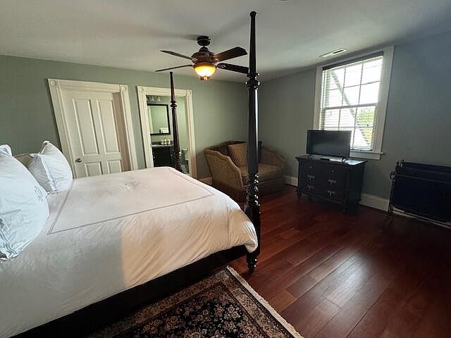 This tranquil master bedroom area features rich hardwood flooring that adds warmth and sophistication. The four-poster bed, dressed in crisp white linens, serves as the room’s focal point, complimented by a classic patterned rug beneath. Walls painted in a soft sage green create a soothing backdrop, harmonizing with the white door trims and ceiling. A cozy armchair placed in the corner offers a quiet nook for relaxation beside a small, dark wood dresser topped with a compact television. Overhead, a ceiling fan with an integrated light fixture adds both functionality and subtle elegance to the space.