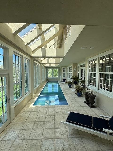 This serene indoor pool area features an elongated, narrow pool set within a light beige tiled floor, enhancing the airy ambiance. Natural light floods the space through large, multi-pane windows that line one wall, complemented by an elevated glass ceiling with exposed beams, allowing sunlight to reflect beautifully on the water. The opposite wall showcases classic white-framed windows and multiple doors, adding symmetry and openness. The room includes tasteful dark blue cushioned lounge chairs that contrast with the neutral tones, and an assortment of potted plants introduces lush greenery, creating a calm, inviting retreat.