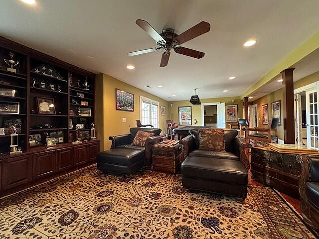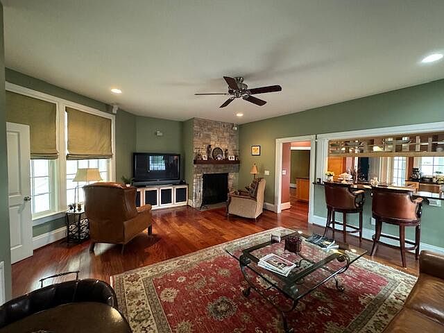 This inviting living room features warm hardwood flooring complemented by a traditional red patterned area rug that anchors the seating arrangement. Soft sage-green walls create a calming ambiance, offset by white trim and molding that frame windows and doorways. A stone fireplace serves as the focal point, flanked by built-in cabinetry housing a flat-screen TV. Comfortable leather and upholstered chairs, along with a glass-topped coffee table, enhance the room’s relaxed elegance. A ceiling fan with dark wood blades and recessed lighting add functionality while maintaining a stylish yet cozy atmosphere, perfect for gathering or quiet moments.