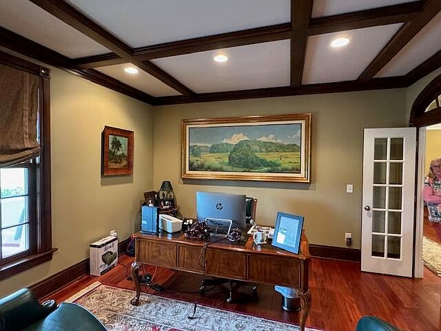 This cozy home office blends traditional design with warm, earthy tones. A large wooden desk with elegant carved legs is the room’s centerpiece, positioned against a muted olive-green wall. Above, a framed landscape painting adds a serene touch, while a smaller framed piece enhances the wall’s character. The ceiling features dark wood beams that contrast softly with the neutral paint, adding architectural interest and a feeling of depth. Rich hardwood floors run throughout, complemented by a patterned area rug beneath the desk. A window with wooden trim and a brown roman shade brings natural light, and a French door opens to an adjacent space, inviting connectivity within the home.