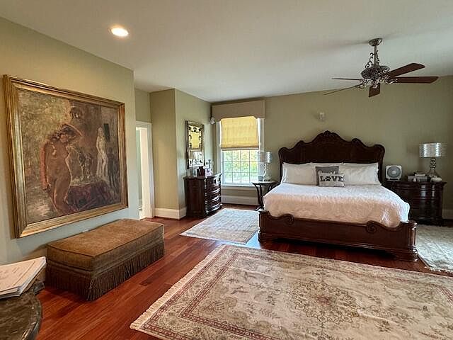 This spacious master bedroom features warm hardwood floors complemented by large area rugs adding texture and comfort. The room is painted in a soft neutral tone, creating a calm and inviting atmosphere. The dark wood bed frame with an elegantly carved headboard is paired with matching bedside tables, each topped with shiny silver lamps to provide balanced lighting. A large window with a roman shade allows natural light to softly filter in. An oversized framed painting and a luxurious upholstered bench with fringe detail add artistic and classic touches, while a ceiling fan provides subtle movement and comfort.