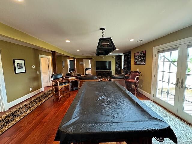 This spacious game room centers around a large pool table covered with a protective black cloth. The room features warm tan walls that complement the rich reddish-brown hardwood floors, creating a cozy yet lively atmosphere. Recessed ceiling lights provide even illumination, while a distinctive black hanging light fixture above the pool table adds a focal point. Along one wall, comfortable black leather seating with high backs invites relaxation, facing a large flat-screen TV mounted above built-in cabinetry. French doors with white trim open to an outdoor area, allowing natural light to fill the room. A patterned runner rug runs along the side, enhancing the inviting feel.