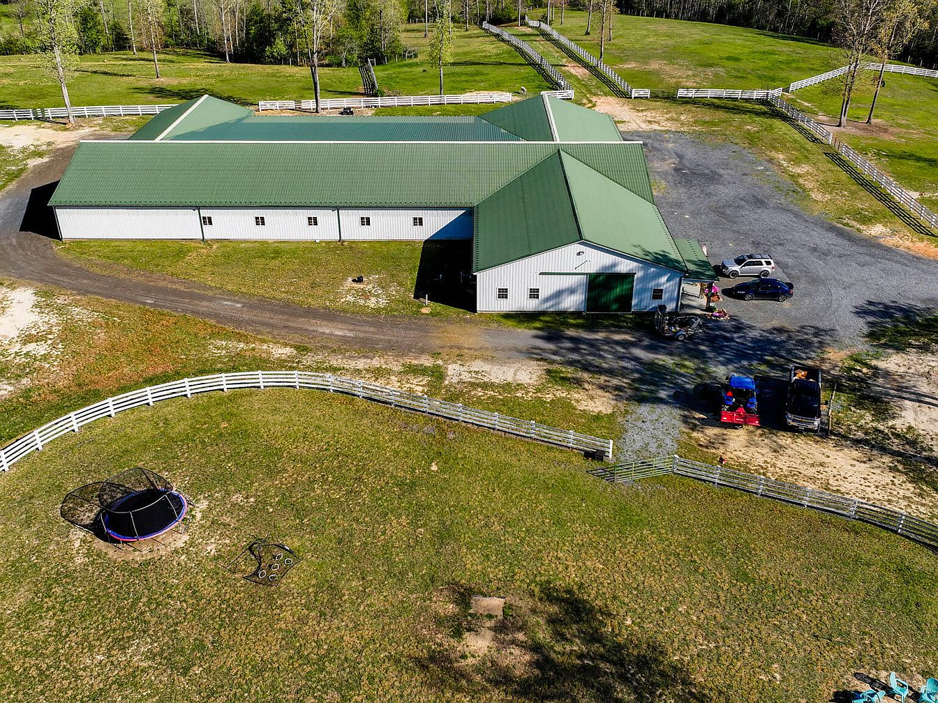 This spacious rural property features a large white building with a green metal roof, designed for versatile use. The structure has multiple roof sections, indicating different interior areas or wings. Surrounding the building is a mix of gravel and grass, with a neatly maintained curved white fence enclosing a grassy field. In this field, a trampoline and a small climbing structure provide recreational options. Multiple vehicles and equipment are parked near the building, emphasizing its practical, working nature. The landscape is dotted with trees and bordered by additional fencing, creating a peaceful, expansive countryside environment.