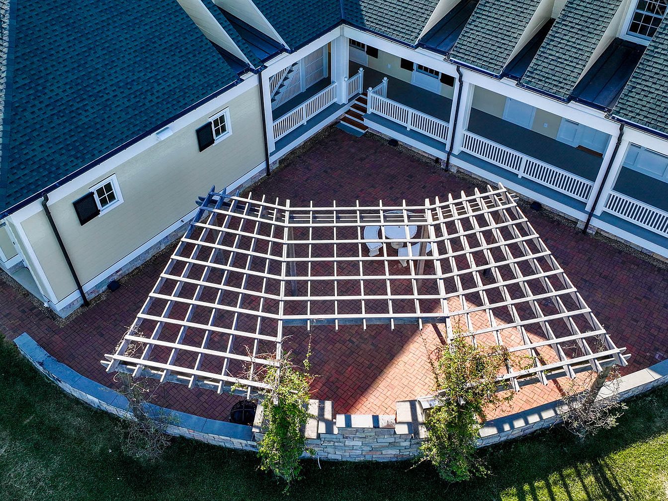This charming outdoor courtyard patio showcases a spacious brick-paved flooring surrounded by a low stone wall, enhancing its cozy enclosure feel. At the center, a lattice pergola with white wood beams forms a geometric canopy, inviting climbing plants to grow and add natural greenery over time. The courtyard is bordered by the home’s exterior walls painted in soft beige with crisp white trim and black shutters, highlighting a classic, clean aesthetic. A covered porch with white balustrades runs along the adjacent walls, accessible by a few steps, perfect for seating or socializing outdoors. The roofing features traditional grey shingles, harmonizing with the overall neutral color palette and creating a serene atmosphere for relaxing or entertaining.