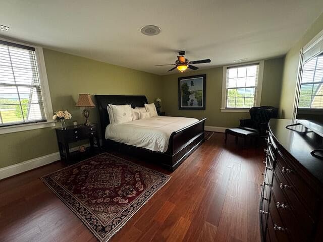 This spacious master bedroom features warm wooden flooring that complements the dark wood furniture, including a large sleigh bed with crisp white bedding, a matching dresser, and a nightstand with a classic lamp. The walls are painted in a muted green, creating a calm and inviting atmosphere. Natural light floods the room through two sizable windows framed with white trim, enhancing the airy feel. A richly patterned area rug adds texture and color near the foot of the bed. A cozy reading nook with a leather wingback chair and ottoman is tucked near one window, completing the elegant yet comfortable design.