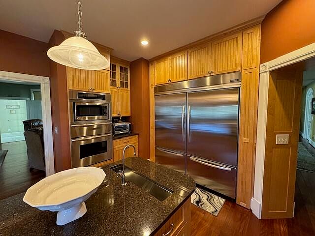 This kitchen section highlights a warm, inviting workspace accented by rich wooden cabinetry with beadboard panels, contributing to a classic yet cozy aesthetic. The dominant color of the cabinetry complements the deep reddish-brown walls, making the space feel grounded and intimate. Stainless steel built-in appliances, including a double wall oven and expansive refrigerator, add a sleek, modern contrast. A small kitchen island features a polished, dark granite countertop with an integrated stainless steel sink, offering practical functionality and a stylish focal point. The hardwood floor continues the warm tone, while an overhead pendant light casts a soft, warm glow over the area.
