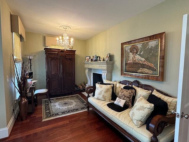 This intimate sitting room features warm hardwood flooring paired with soft beige walls, creating a welcoming ambiance. A classic upholstered wooden settee adorned with a mix of patterned and solid cushions invites relaxation. Opposite the seating, an intricately carved wooden armoire stands out as an elegant storage piece, adding a touch of vintage charm. The carved white fireplace mantel acts as a focal point, embellished subtly with family photos and small decor. Above it, a rustic framed painting enhances the room’s traditional aesthetic. A small area rug defines the space, complementing its refined and cozy atmosphere.