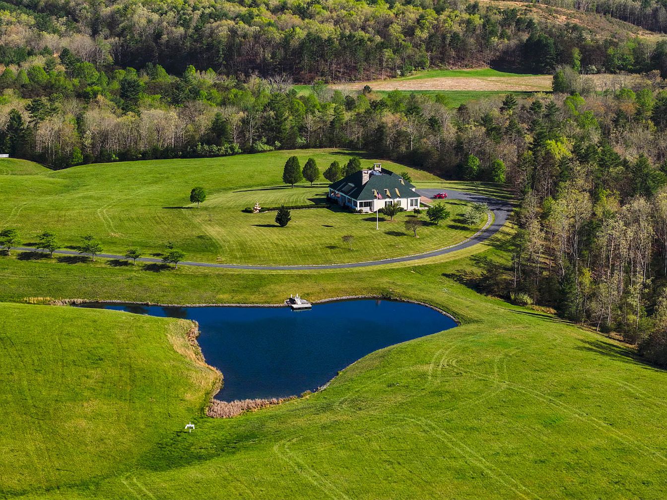 Surrounded by expansive rolling green fields and dense forest, the sprawling estate sits at the center of a manicured lawn, accentuated by a curving driveway. The main house features a slate-green roof complementing its white exterior, flanked by a variety of mature trees and shrubs that add elegance and privacy. A tranquil, deep blue pond lies in the foreground, with a small dock extending over the water, creating a peaceful retreat. This setting blends natural beauty with thoughtful landscaping, evoking a serene, picturesque rural lifestyle.