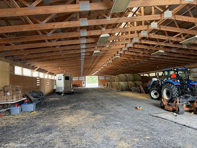 This spacious barn serves as a practical storage area for farm equipment and supplies. The high, exposed wooden beam ceiling with metal reinforcements adds structural strength and rustic charm. Natural light filters through rectangular windows lining the upper walls, brightening the area. Rows of tightly stacked hay bales occupy one side, while a blue tractor with various attachments is parked on the other. The wide central aisle is clear for vehicle movement or loading, with a gravel floor that supports heavy machinery and livestock trailers, emphasizing functionality within an agricultural setting.