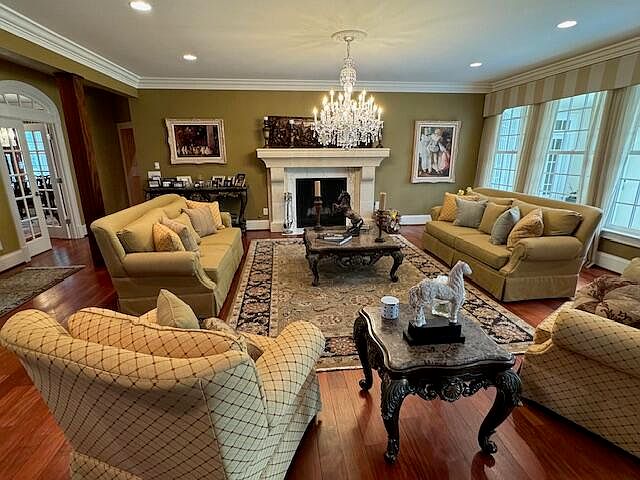 This elegant living room features a classic layout centered around a prominent white stone fireplace with a decorative mantel. Two mustard-colored sofas face each other, complemented by two patterned armchairs with a neutral palette in the foreground. The rich, polished hardwood flooring anchors the space, paired with an ornate area rug that blends intricate patterns in muted tones. Wall colors are a warm olive green, coordinated with crown molding and a striped ceiling border. Light floods in through large, multi-pane windows draped in simple sheer curtains, while a grand crystal chandelier illuminates the room, adding refined sophistication.