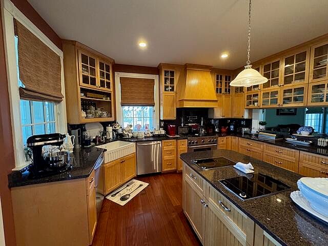 This kitchen features a warm and inviting ambiance created by rich wooden cabinetry paired with black granite countertops, offering both elegance and durability. The cooktop is integrated into a central island that provides extra workspace, storage, and a casual dining spot. Stainless steel appliances add a modern touch, contrasting subtly with the traditional wood finishes. Glass-front cabinets above offer display space for glassware, enhancing the room’s openness. Soft lighting from recessed ceiling fixtures and a pendant light above the island ensures a bright and welcoming workspace. Roman shades on the windows bring a cozy texture, complementing the hardwood floor.